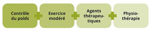 Le traitement de l'arthrose est basé sur ces 4 piliers. Je vous propose un suivi personnalisé de votre animal en fournissant des exercices adaptés, une réévaluation de son alimentation, un suivi ostéopathique et une médication adaptée à sa pathologie.